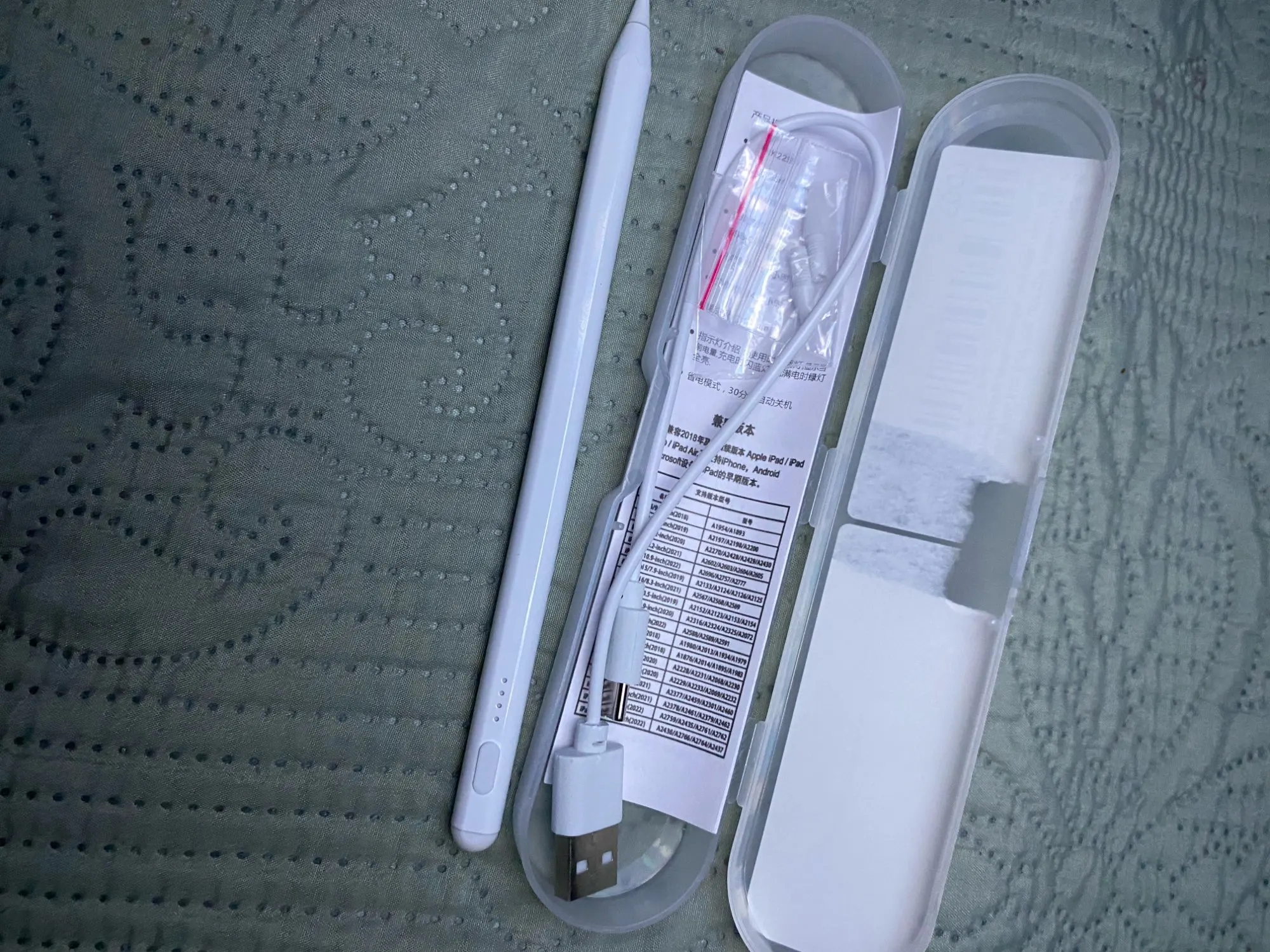 Arslan Ali Arrived in excellent condition. Came in a small portable case with two extra nibs and a charger. It connects instantly, no bluetooth needed. Very smooth to use and the palm rejection is just beautiful. I have the ipad pro (fifth generation) and it works just fine. 10/10 would recommend.